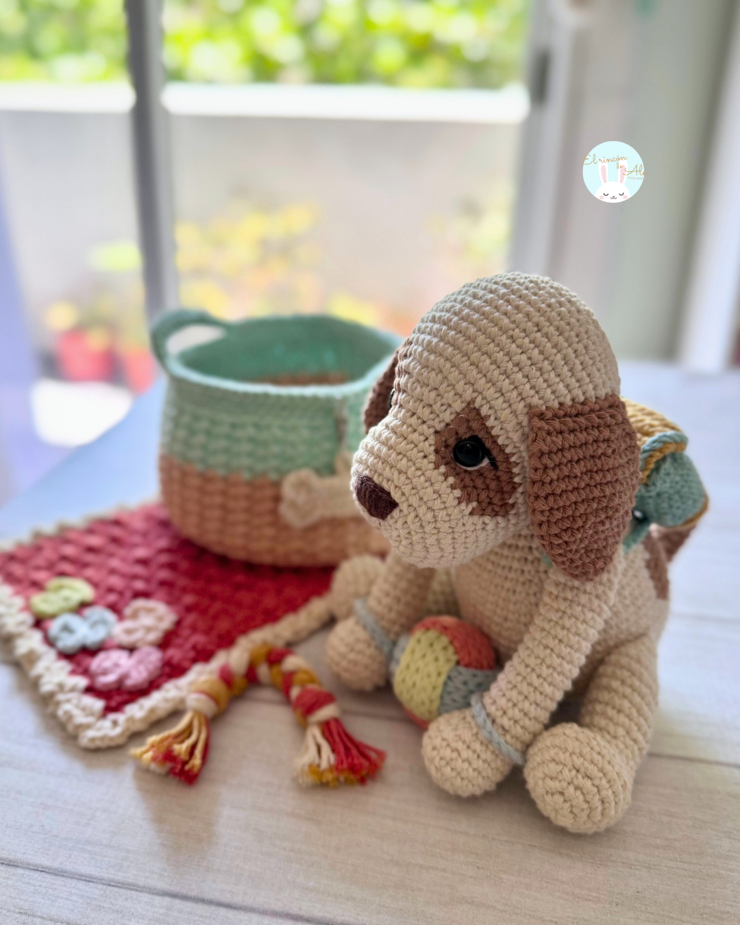 - Medidas: Rocco mide 18 cm sentado, utilizando el hilado sugerido en grosor DK o algodón 8/6 (Argentina). Cantidad de hilado para todo el proyecto: 210 grs aprox.