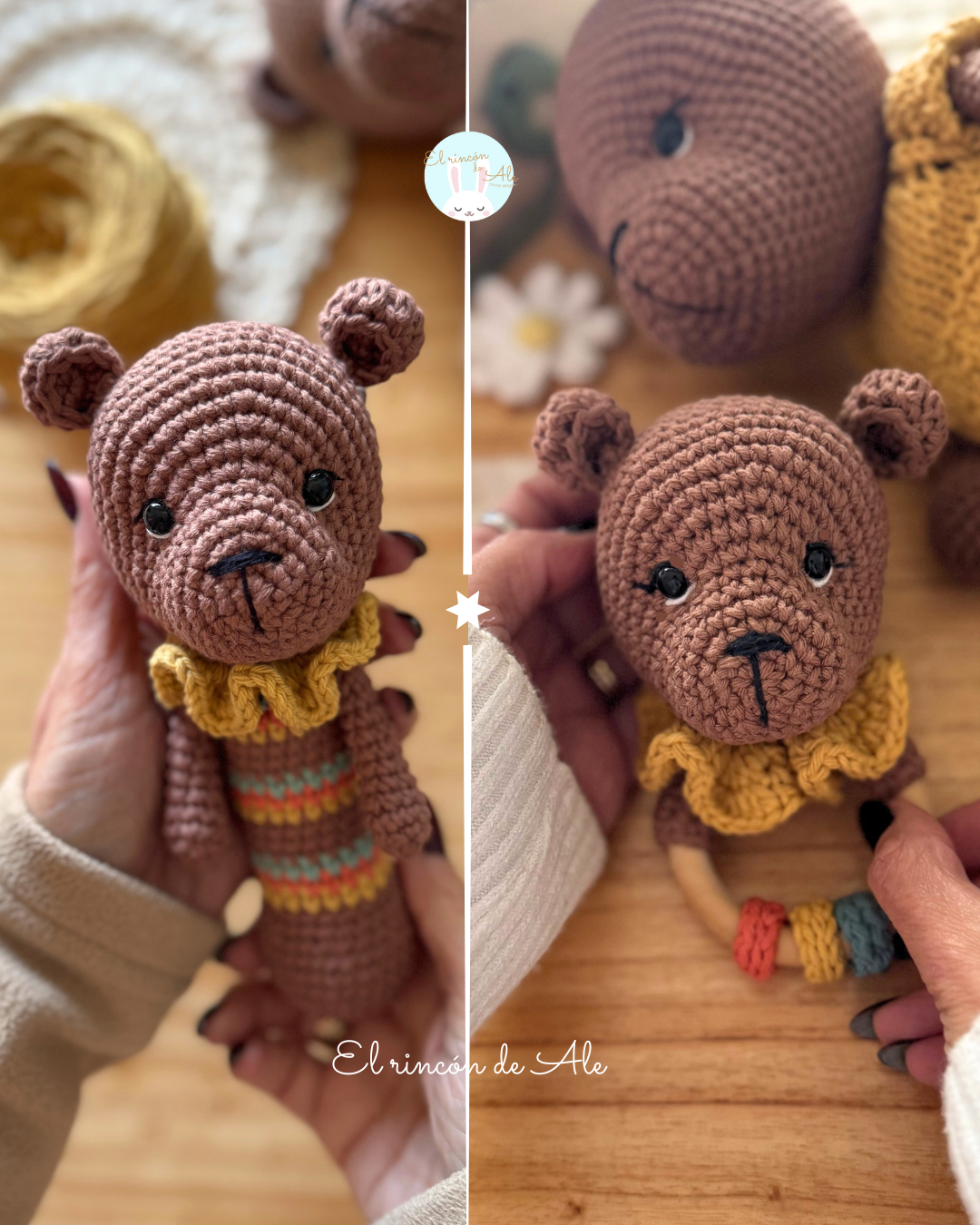 - Mencionarme como autora del diseño en tus posteos, arrobarme o etiquetarme. Compartir tu proyecto en Redes Sociales, usando los hashtags: #elrincondeale #osoBenja #patroneselrincondeale